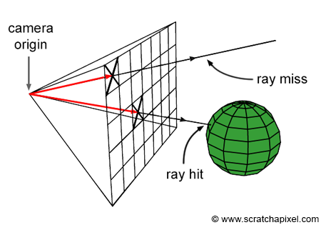 The camera will emit one or more rays, where a ray is represented by an origin point and a direction point. Conceptually, the ray is emitted from the origin and continues in the given direction until it intersects an object.