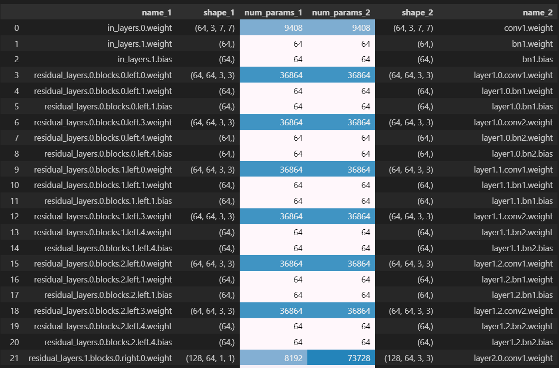 Looking closer at the dataframe, we see that the left-hand parameter (from our model) has shape (128, 64, 1, 1) and has right in its name, so we deduce it's the 1x1 convolutional weight from the right branch. But the parameter from the PyTorch model has shape (128, 64, 3, 3), i.e. it's a convolutional weight with a 3x3 kernel, so must be from the left branch (it also matches the naming convention for the left-branch convolutional weight from the first blockgroup - row index 3 in the dataframe). So we've now figured out what the problem is: your implementation defines the right branch before the left branch in the the ResidualBlock.__init__ method, and to match param orders with the PyTorch model you should swap them around.