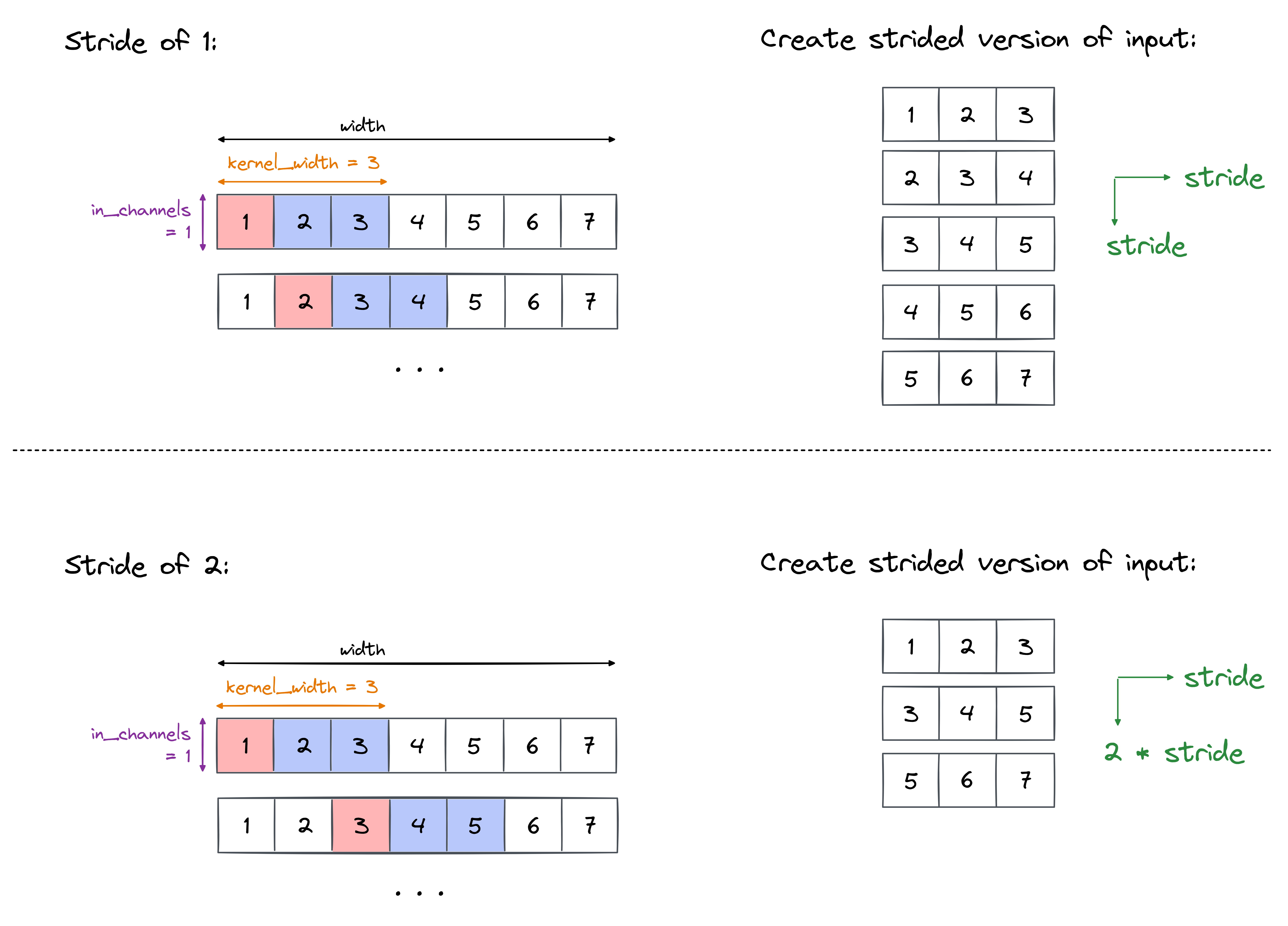 The following diagram shows how you should create the strided version of x differently, if you have a stride of 2 rather than the default stride of 1.