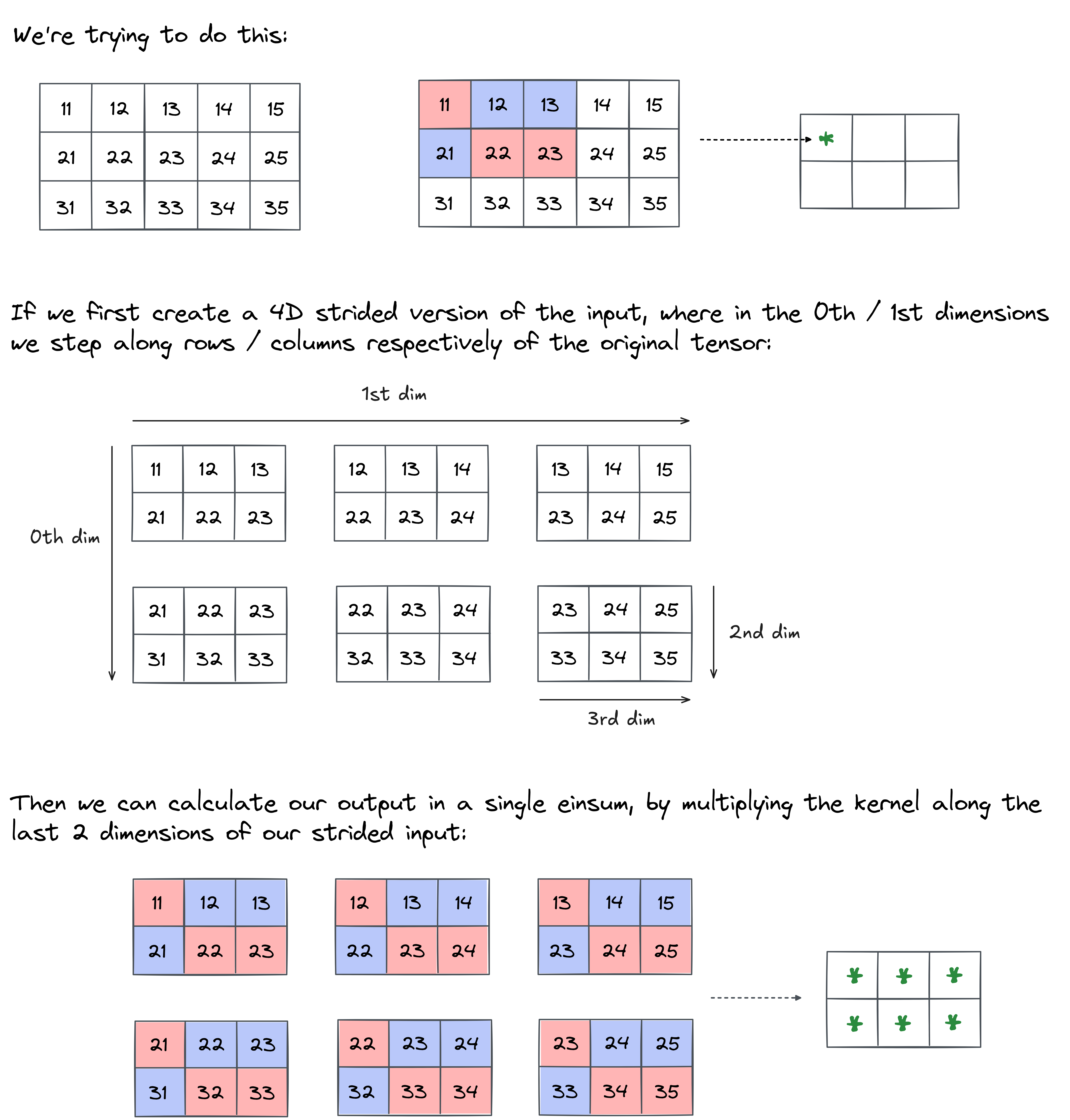 This section is designed to get you familiar with the implementational details of layers like Linear and Conv2d. You'll be using libraries like einops, and functions like torch.as_strided to get a very low-level picture of how these operations work, which will help build up your overall understanding.