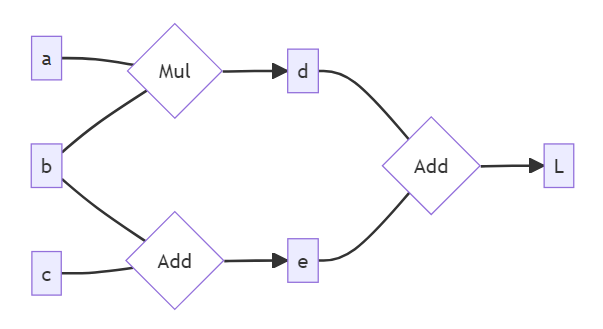 It's important that the grads be accumulated instead of overwritten in a case like value $b$ which has two outgoing edges, since $\frac{dL}{db}$ will then be the sum of two terms. Since addition is commutative it doesn't matter whether we backward() the Mul or the Add that depend on $b$ first.