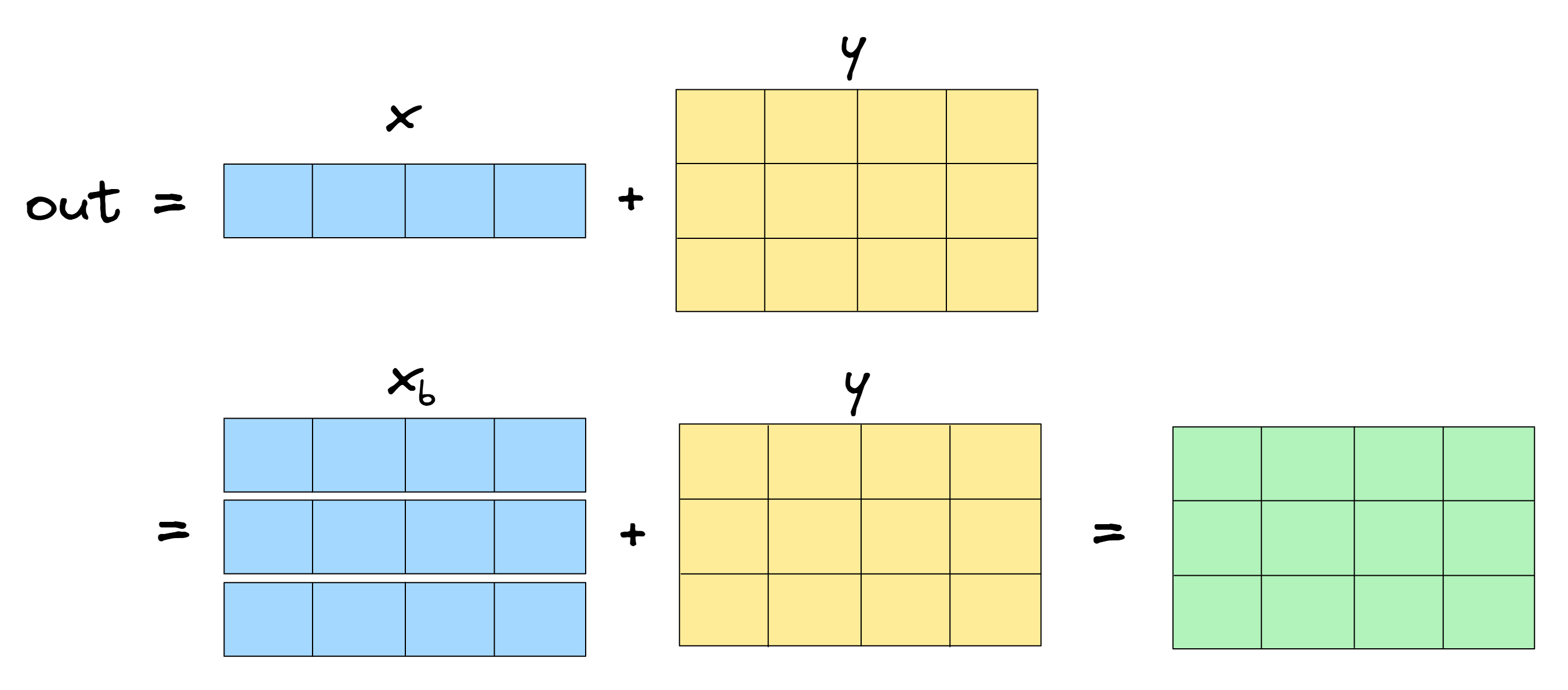 out = x_b + y, which is an operation that doesn't involve broadcasting.