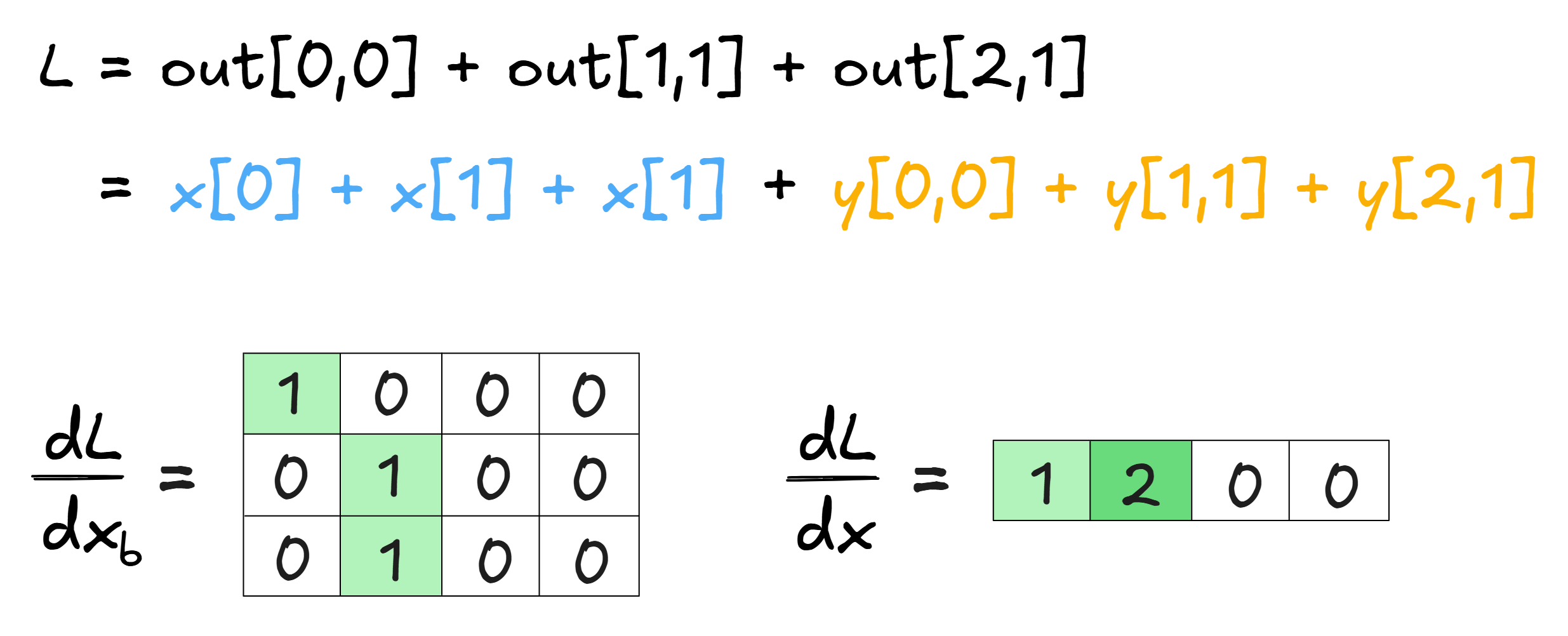 using the chain rule. Next, we can use the fact that $\frac{\partial x_b[i_1, i_2, ...]}{\partial x[j_1, j_2, ...]}$ equals 0 everywhere except the indices where $x$ was broadcasted to produce $x_b$, where it equals 1. Therefore, this sum over indices $i_1, i_2, ...$ is equivalent to just summing $\frac{\partial L}{\partial x_b[i_1, i_2, ...]}$ over the repeated elements of $x$.
