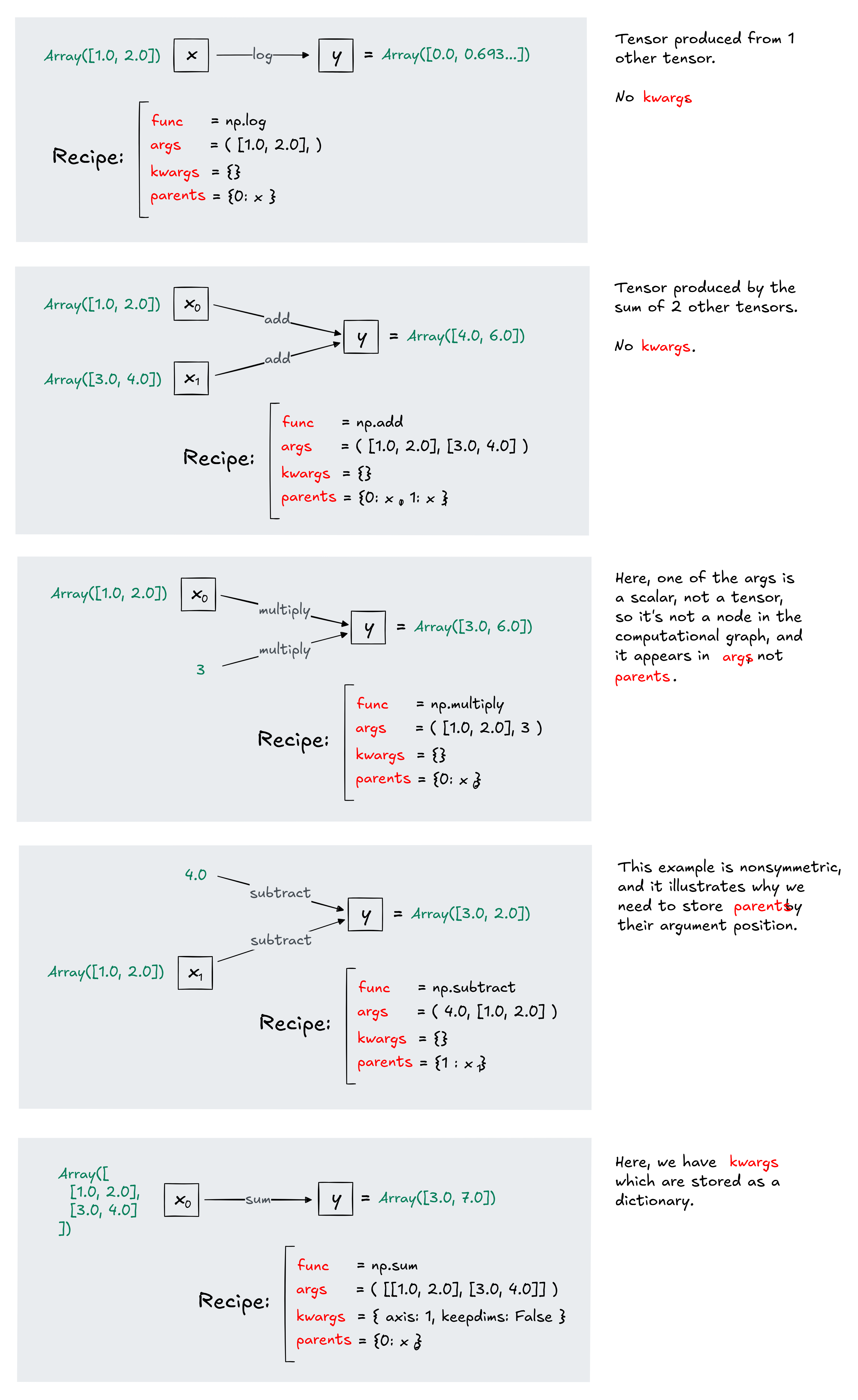 Here are some examples, to build intuition for what the four fields of Recipe are, and why we need all four of them to fully describe a tensor in our graph and how it was created. Make sure you understand each of these examples before moving on, because it'll really help you progress quickly through the following exercises.