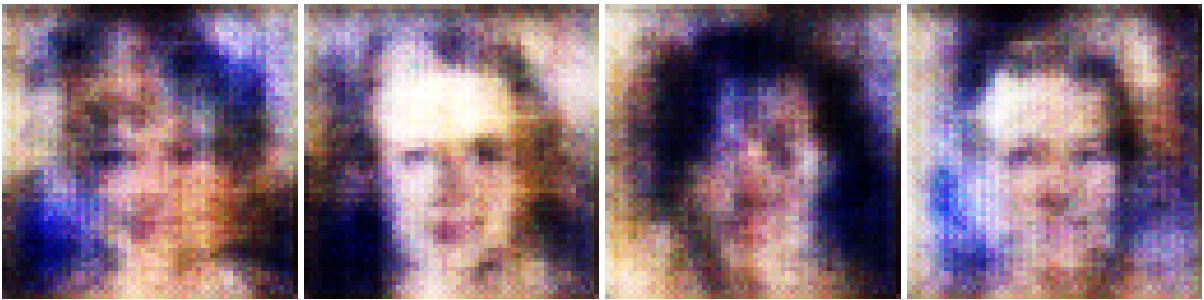 Note that the MNIST model is very small in comparison to CelebA - if you make it any larger, you fall into a very common GAN failure mode where the discriminator becomes perfect (loss goes to zero) and the generator is unable to get a gradient signal to produce better images - see next section for a discussion of this. Larger architectures are generally more likely to fall into this failure mode, and empirically it seems to happen more for MNIST than for CelebA which is why we generally recommend using the CelebA dataset & architecture for this exercise - although this failure mode can happen in both cases!
