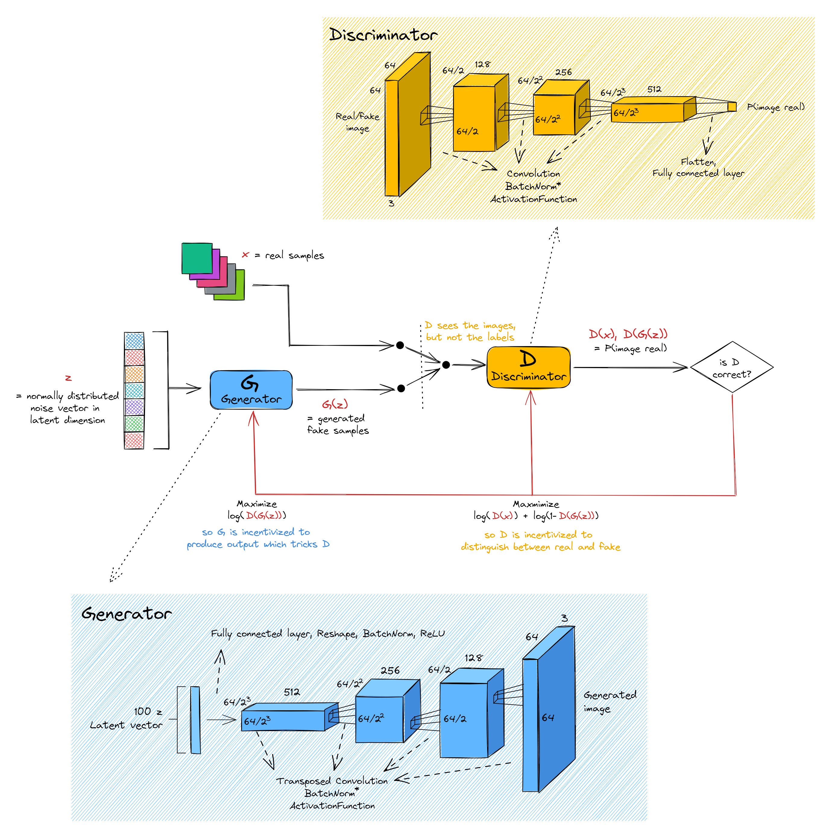 The architecture of generators in a GAN setup is generally a mirror image of the discriminator, with convolutions swapped out for transposed convolutions. This is the case for the DCGAN paper we'll be reading (which is why they only give a diagram of the generator, not both). The generator works by taking in a vector $z$, whose elements are all normally distributed with mean 0 and variance 1. We call the space from which $z$ is sampled latent dimension or latent space, and we call $z$ a latent vector. The formal definition of a latent space is an abstract multi-dimensional space that encodes a meaningful internal representation of externally observed events. We'll dive a little deeper into what this means and the overall significance of latent spaces later on, but for now it's fine to understand this vector $z$ as a kind of random seed, which causes the generator to produce different outputs. After all, if the generator only ever produced the same image as output then the discriminator's job would be pretty easy (just subtract the image $g$ always produces from the input image, and see if the result is close to zero!). The generator's objective function is an increasing function of $D(G(z))$, in other words it tries to produce images $G(z)$ which have a high chance of fooling the discriminator (i.e. $D(G(z)) \approx 1$).