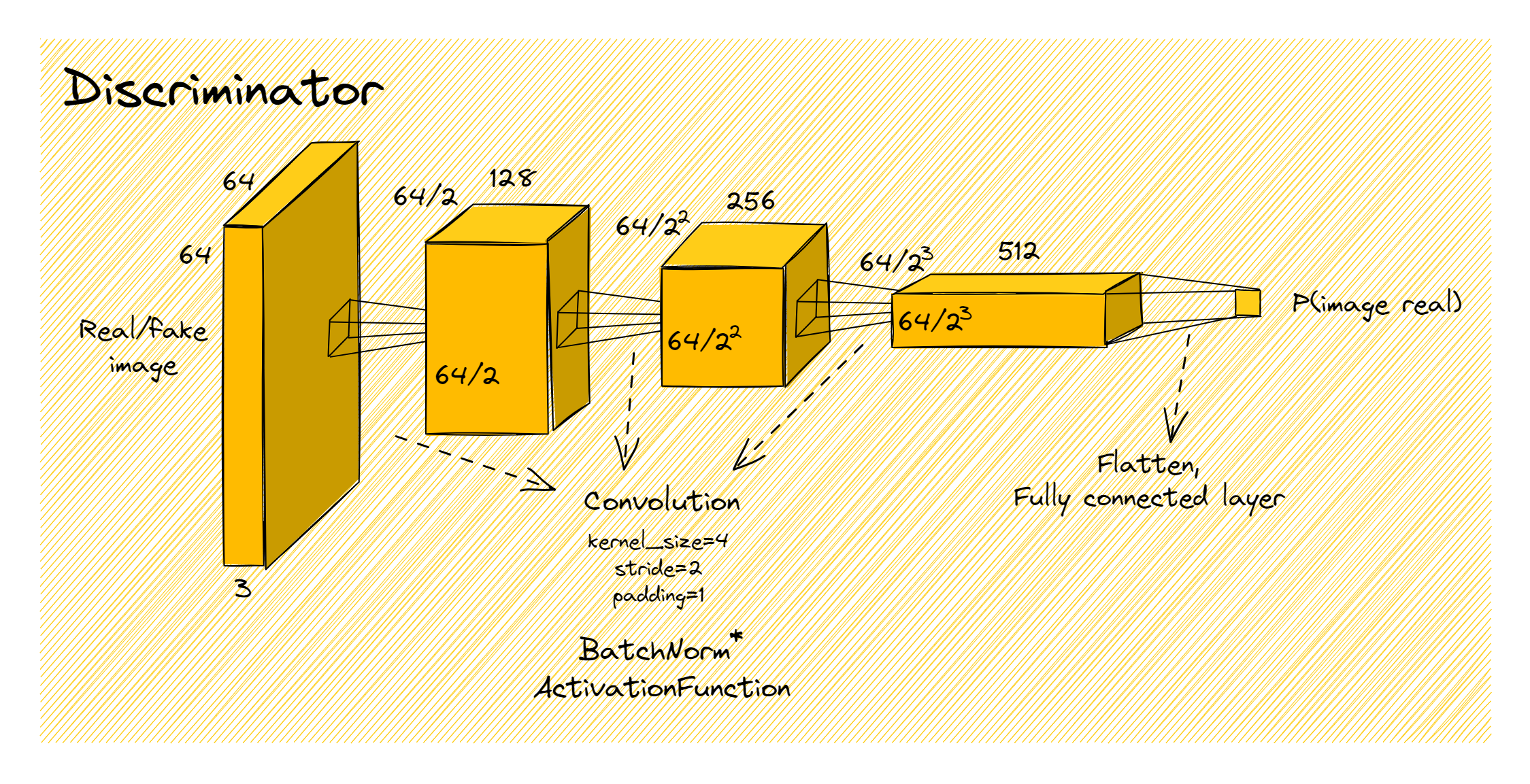 Lastly, we flatten the output of the final convolutional block, and use a fully connected layer to map it to a single value (i.e. a vector of length batch_size) which we then pass through a sigmoid to get a probability that the image is real. Again, we recommend the Rearrange module from the einops library for this.