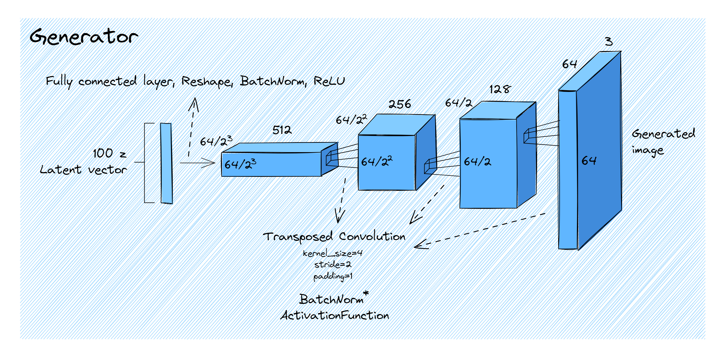 - Each transposed convolution has kernel size 4, stride 2, padding 1. Like for the discriminator, the input & output channels of the convolutions are determined by the
