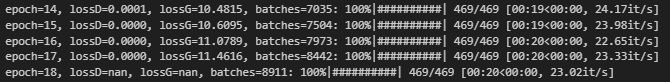 However after this point it broke, and produced NaNs from both the discriminator and the generator: