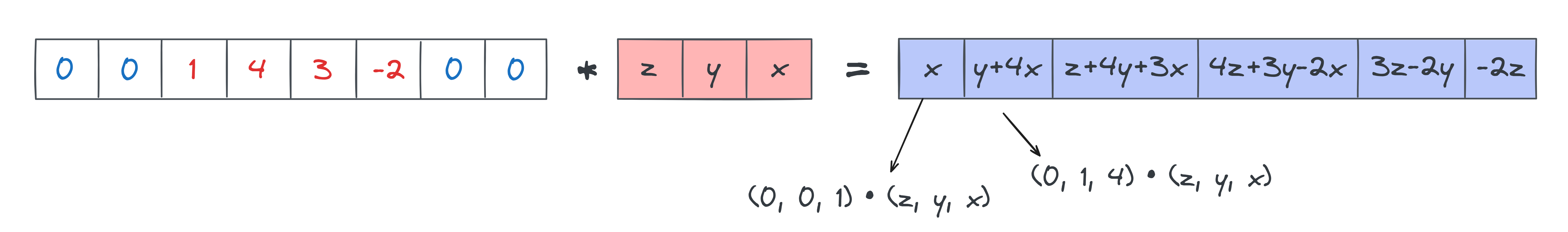 From looking at the diagram, note that the final output (the blue row at the bottom) looks a bit like sliding the _reversed_ kernel over the input. In other words, we get elements like z+4y+3x which are an inner product between the input slice input[:3] = [1, 4, 3] and the reversed kernel [z, y, x]. This suggests we should be using the reversed kernel in our convolution.