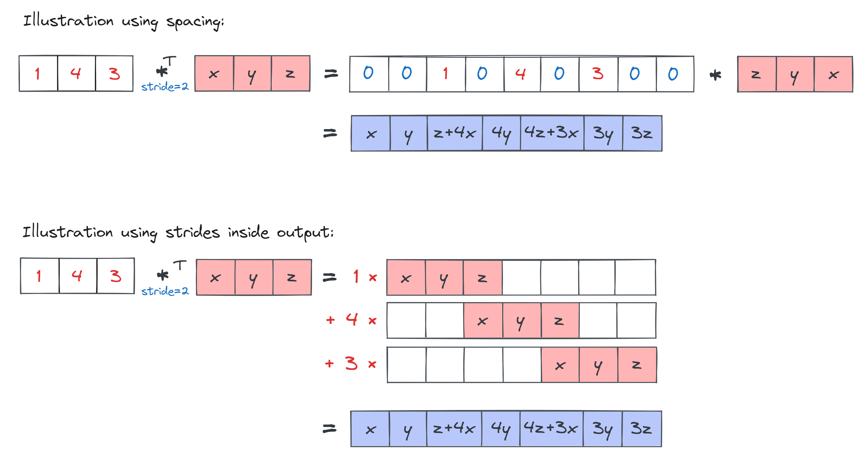 Finally, consider stride. As mentioned above, we can consider stride here to have the same effect as "spacing out" elements in the input. Each non-zero element will be stride - 1 positions apart (for instance, stride = 2 turns [1, 2, 3] into [1, 0, 2, 0, 3]). You can check that the number of zeros added between elements equals (input_size - 1) (stride - 1). When you add this to the right hand side, and simplify, you are left with: