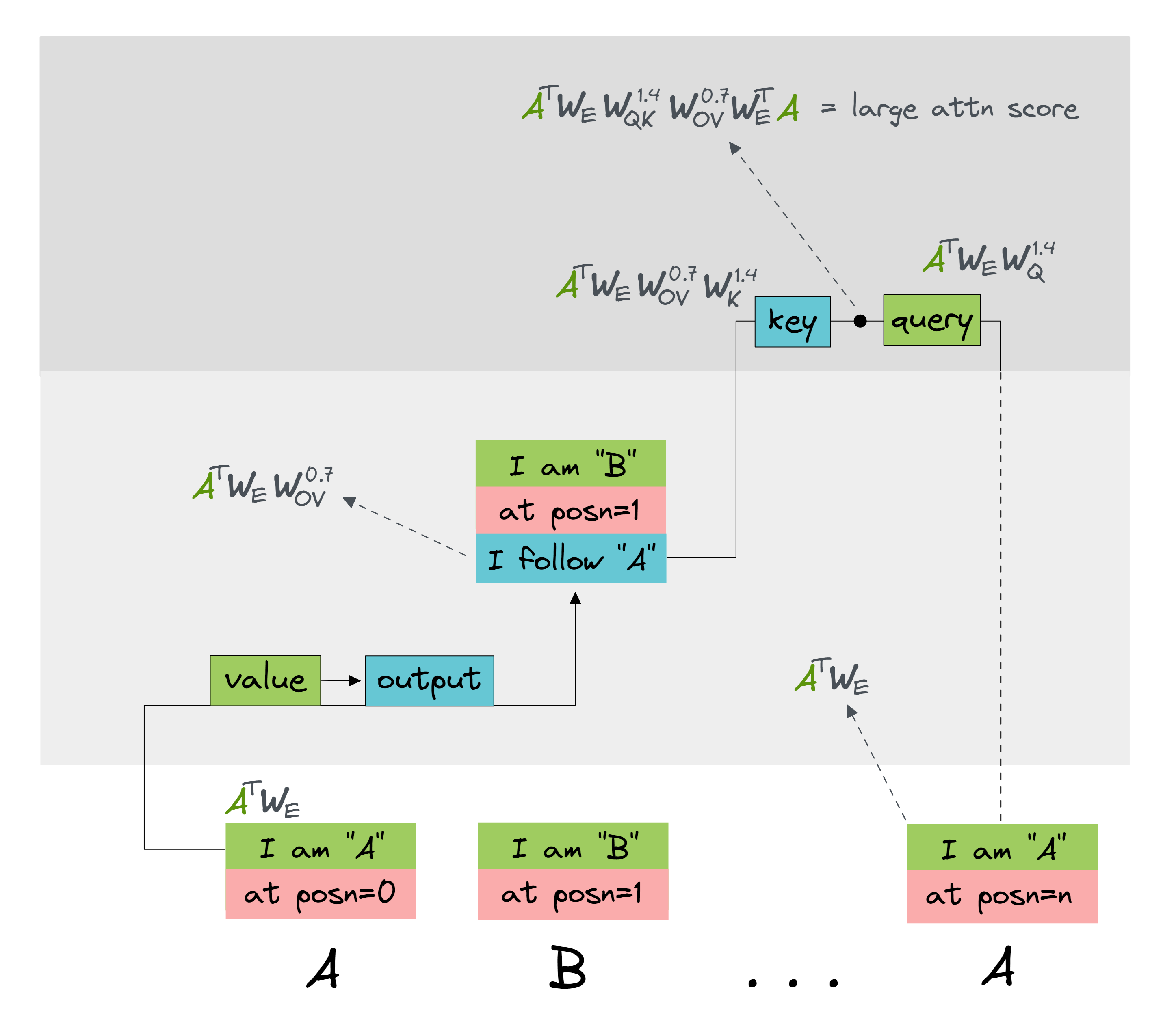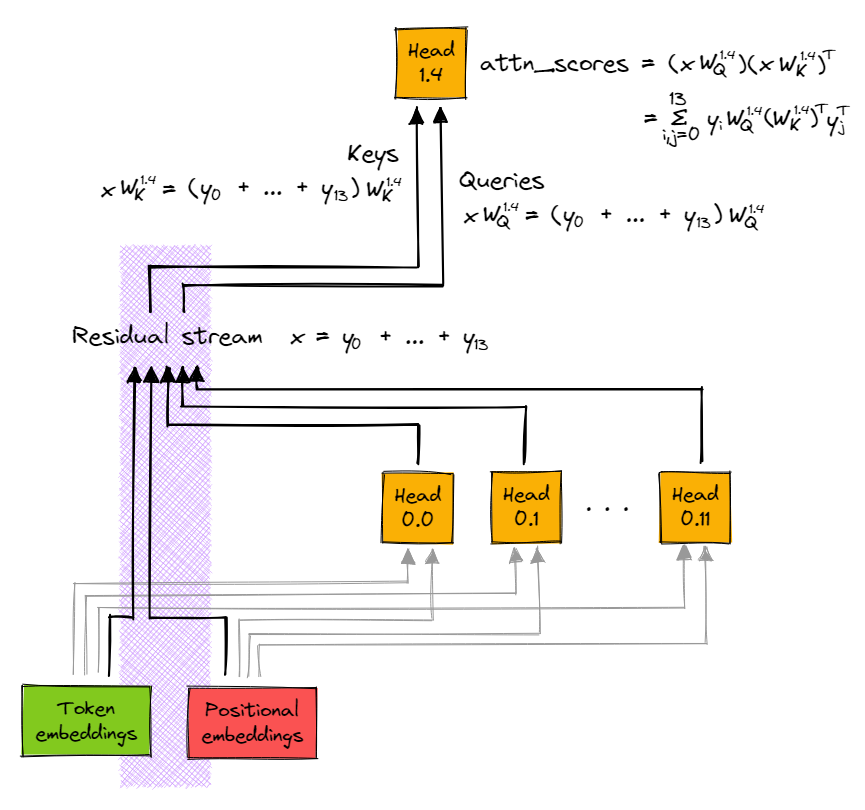 Before we start, a brief terminology note. I'll refer to weight matrices for a particular layer and head using superscript notation, e.g. $W_Q^{1.4}$ is the query matrix for the 4th head in layer 1, and it has shape [d_model, d_head] (remember that we multiply with weight matrices on the right). Similarly, attention patterns will be denoted $A^{1.4}$ (remember that these are activations, not parameters, since they're given by the formula $A^h = x W_{QK}^h x^T$, where $x$ is the residual stream (with shape [seq_len, d_model]).