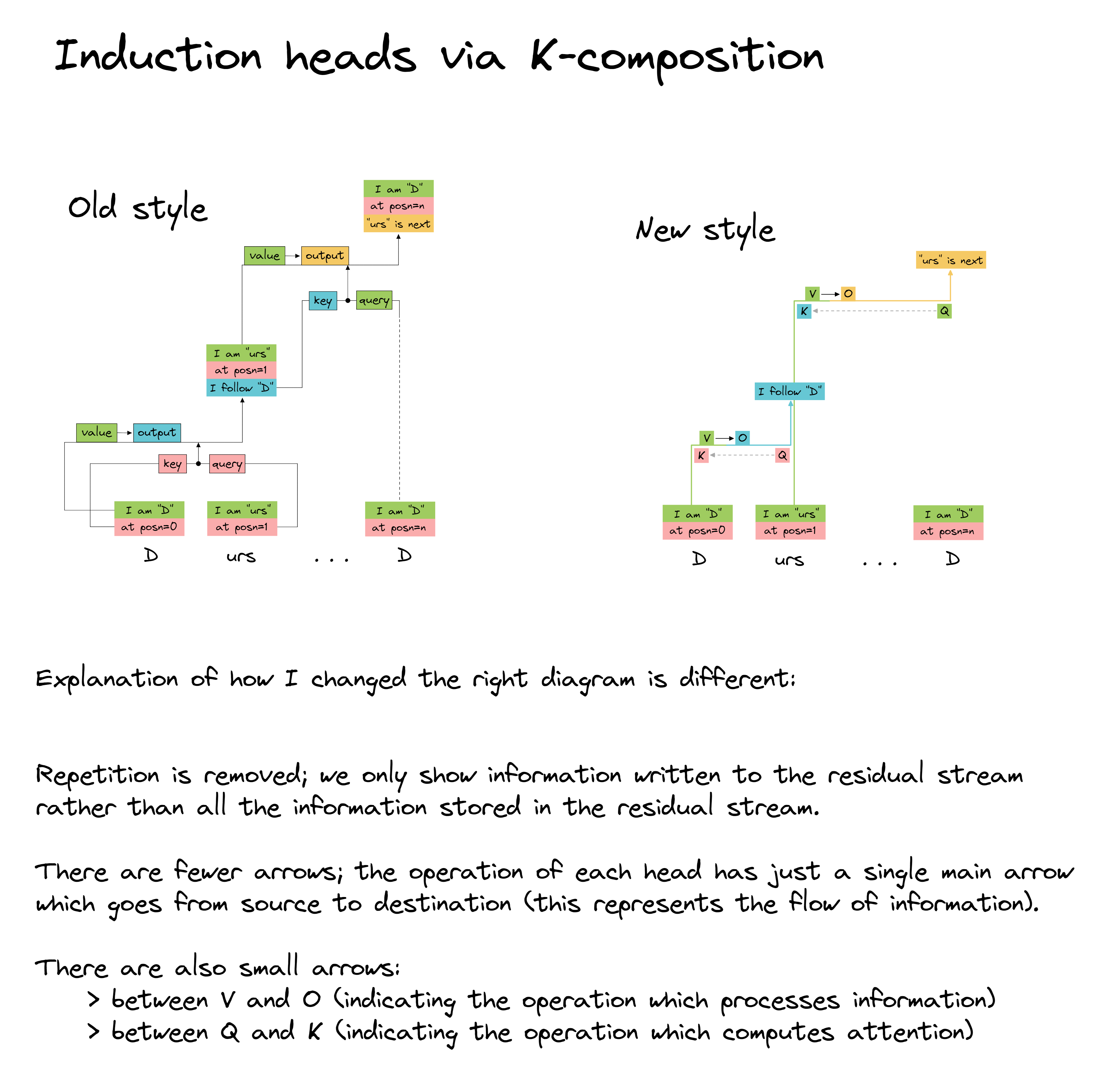 Note - if you're still confused about how to interpret this diagram, but you understand induction circuits and how they work, it might help to compare this diagram to one written in the same style which I made for induction circuits. Also, if you've read my induction heads LessWrong post and you're confused about how this style of diagram is different from that one, here is an image comparing the two diagrams (for induction heads) and explaining how they differ.