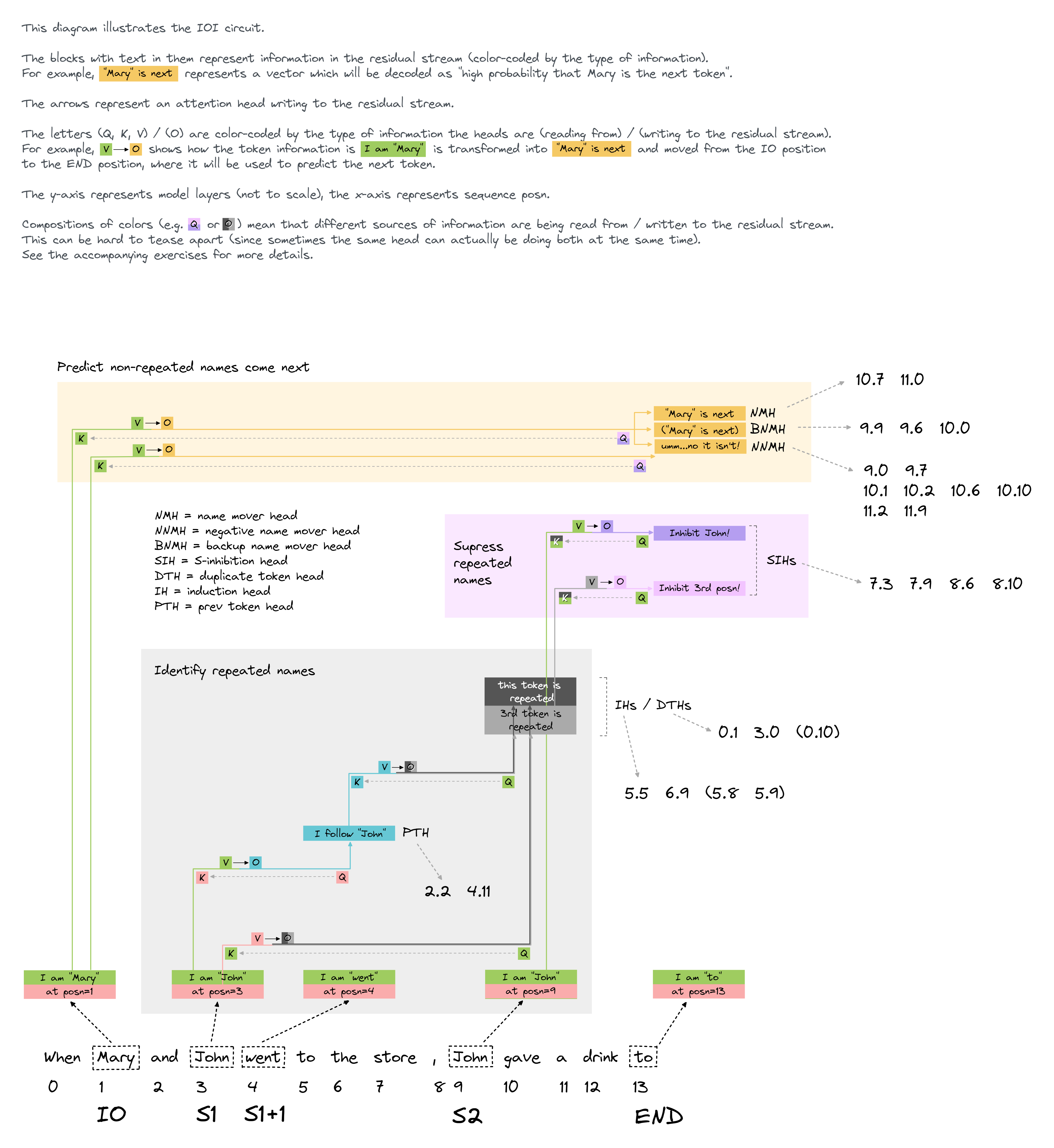 Note - if you're still confused about how to interpret this diagram, but you understand induction circuits and how they work, it might help to compare this diagram to one written in the same style which I made for [induction circuits](https://raw.githubusercontent.com/info-arena/ARENA_img/main/misc/ih-simple.png). Also, if you've read my induction heads [LessWrong post](https://www.lesswrong.com/posts/TvrfY4c9eaGLeyDkE/induction-heads-illustrated) and you're confused about how this style of diagram is different from that one, [here](https://raw.githubusercontent.com/info-arena/ARENA_img/main/misc/ih-compared.png) is an image comparing the two diagrams (for induction heads) and explaining how they differ.