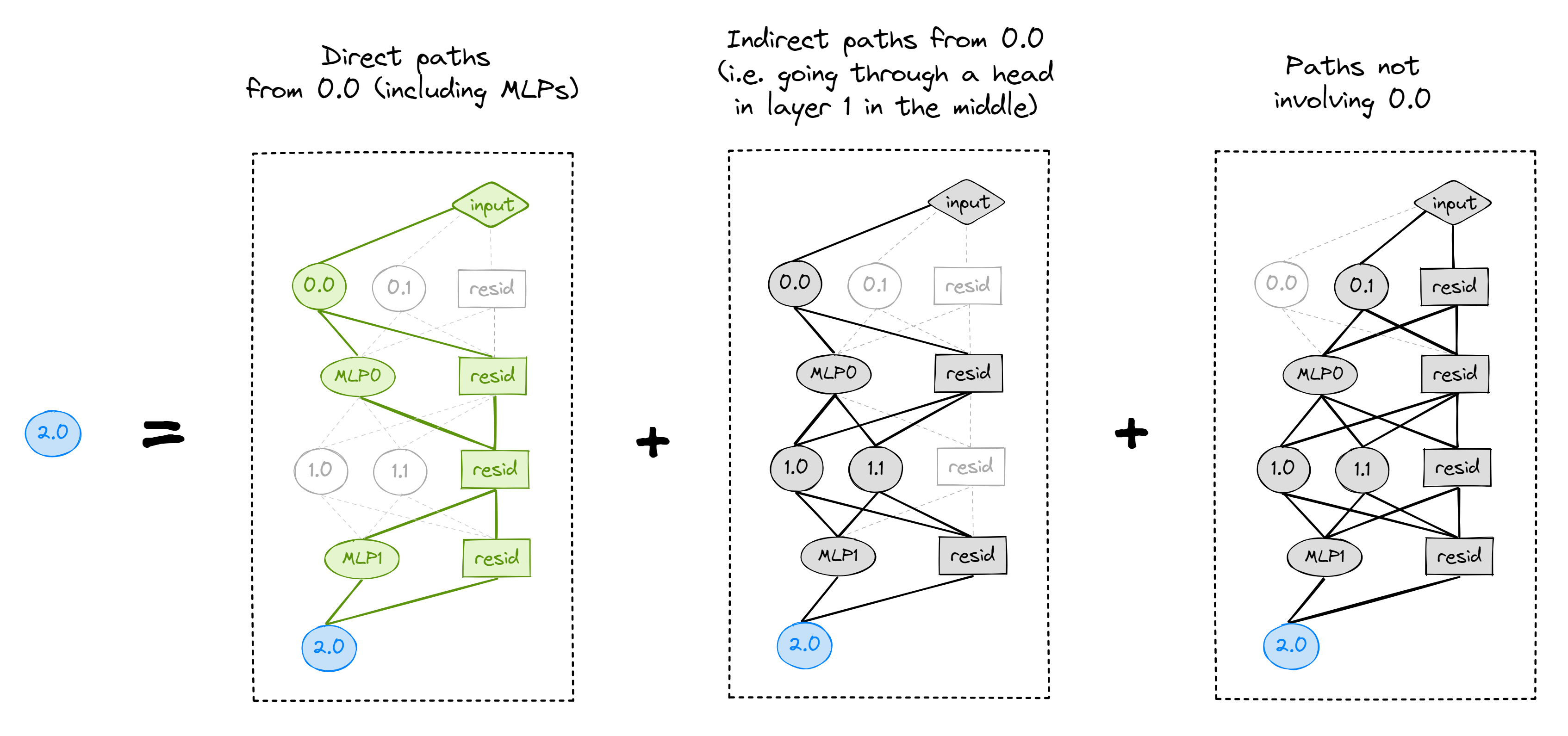 In the previous section, we looked at activation patching, which answers questions like what would happen if you took an attention head, and swapped the value it writes to the residual stream with the value it would have written under a different distribution, while keeping everything else the same?. This proved to be a good way to examine the role of individual components like attention heads, and it allowed us to perform some more subtle analysis like patching keys / queries / values in turn to figure out which of them were more important for which heads.