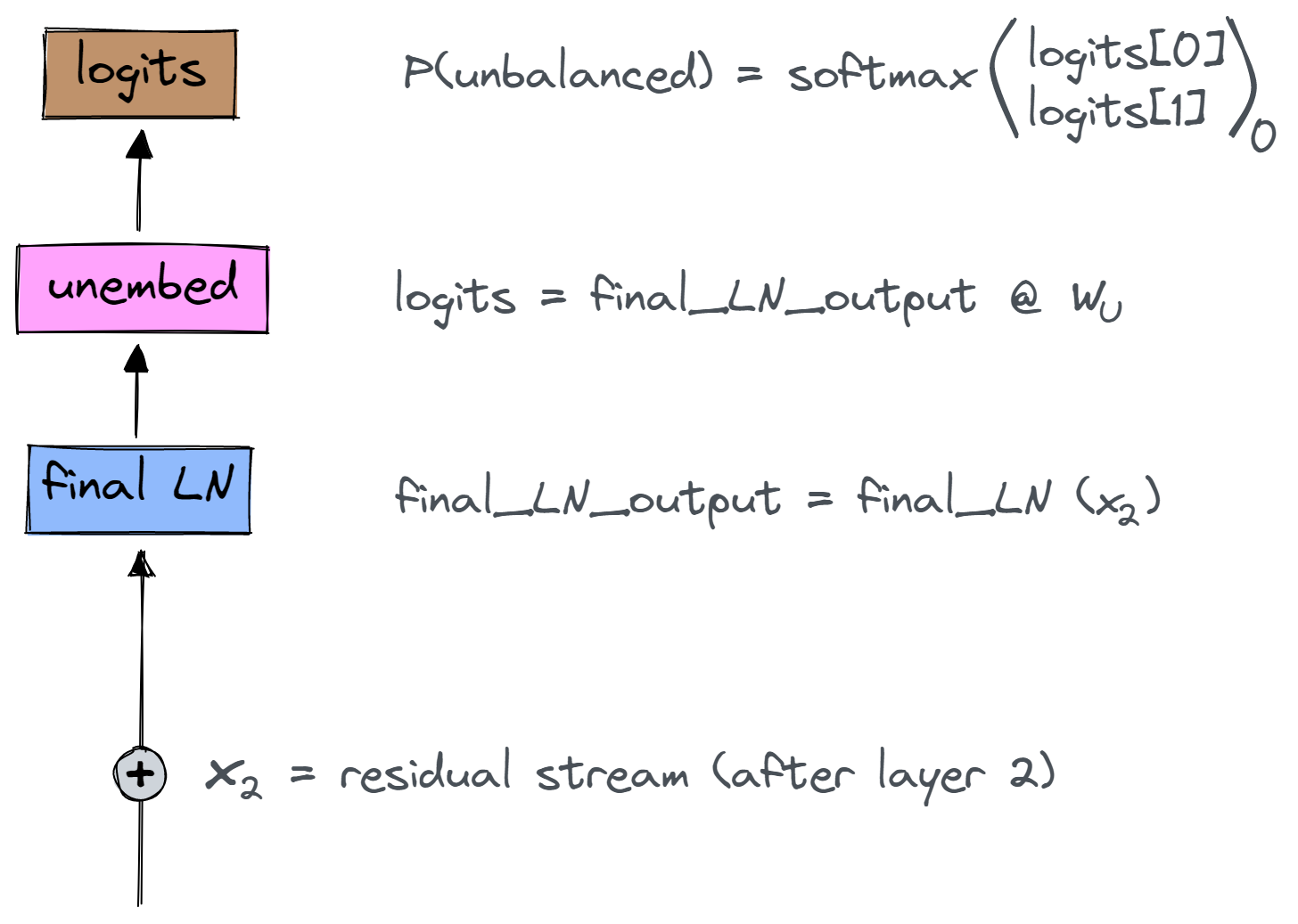 x_2is the vector in the residual stream after layer 2's attention heads and MLPs. It has shape(seq_len, d_model).final_ln_outputhas shape(seq_len, d_model).W_Uhas shape(d_model, 2), and sologitshas shape(seq_len, 2).- We get