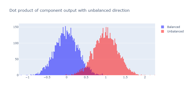 You should normalize it by subtracting the mean of the dot product of this component's output with the unbalanced direction on balanced samples - this will make sure the histogram corresponding to the balanced samples is centered at 0 (like in the figure above), which will make it easier to interpret. Remember, it's only the difference between the dot product on unbalanced and balanced samples that we care about (since adding a constant to both logits doesn't change the model's probabilistic output).