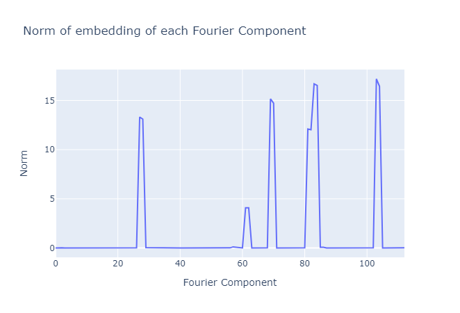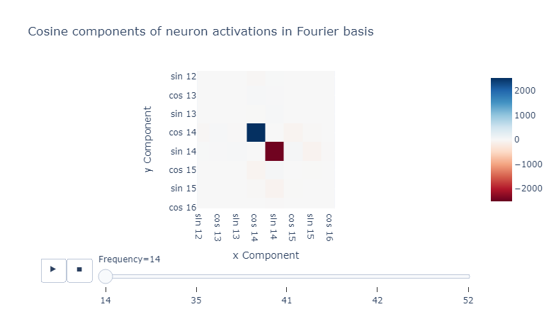 2️⃣ Circuit and Feature Analysis Learning Objectives Apply your understanding of the 1D and 2D Fourier bases to show that the activations / effective weights of your model are highly sparse in the Fourier basis. Turn these observations into concrete hypotheses about the model's algorithm. Verify these hypotheses using statistical methods, and interventions like ablation. Fully understand the model's algorithm, and how it solves the task. Understanding a transformer breaks down into two high-level parts - interpreting the features represented by non-linear activations (output probabilities, attention patterns, neuron activations), and interpreting the circuits that calculate each feature (the weights representing the computation done to convert earlier features into later features). In this section we interpret the embedding, the neuron activations (a feature) and the logit computation (a circuit). These are the most important bits to interpet. Let's start with the embedding. Understanding the embedding Below is some code to plot the embedding in the Fourier basis. You should run this code, and interpret the output. utils.line( (fourier_basis @ W_E).pow(2).sum(1), hover=fourier_basis_names, title="Norm of embedding of each Fourier Component", xaxis="Fourier Component", yaxis="Norm", ) Click to see the expected output Interpretation You should find that the embedding is sparse in the Fourier basis, and throws away all Fourier components apart from a handful of frequencies (the number of frequencies and their values are arbitrary, and vary between training runs). The Fourier basis vector for component $2k$ is: $$ \cos\left(\frac{2 \pi k}{p}x\right)_{x = 0, ..., p-1} $$ and same for $2k-1$, but with $\cos$ replaced with $\sin$. So this result tells us that, for the input x, we're keeping the information $\cos\left(\frac{2 \pi k}{p}x\right)$ for each of the key frequencies $k$, and throwing away this information for all other frequencies $\omega$. Let us term the frequencies with non-trivial norm the key frequencies (here, 14, 31, 35, 41, 42, 52). Another perspective (from singular value decomposition) Recall that we can write any matrix as the product of an orthogonal matrix, a diagonal matrix, and another orthogonal matrix: $$ \begin{aligned} A &= U S V^T \\ &= \sum_{i=1}^k \sigma_i u_i v_i^T \end{aligned} $$ where $u_i$, $v_i$ are the column vectors for the orthogonal matrices $U$, $V$, and $\sigma_1, ..., \sigma_k$ are the non-zero singular values of $A$. If this isn't familiar, you might want to go through the induction heads exercises, which discusses SVD in more detail. This is often a natural way to represent low-rank matrices (because most singular values $\sigma_i$ will be zero). Denote the matrix fourier_basis as $F$ (remember that the rows are basis vectors). Here, we've found that the matrix $F W_E$ is very sparse (i.e. most of its row vectors are zero). From this, we can deduce that $W_E$ is well-approximated by the following low-rank SVD: $$ W_E \approx F^T S V^T $$ because then left-multiplying by $F$ gives us a matrix with zeros everywhere except for the rows corresponding to non-zero singular values: $$ F W_E \approx F^T F S V^T = S V^T $$ In other words, the input directions we're projecting onto when we take the embedding of our tokens $t_0$, $t_1$ are approximately the Fourier basis directions. To directly visualise the matrix product $S V^T$ (which will be sparse in rows because most diagonal values of $S$ are zero), run the following: imshow_div(fourier_basis @ W_E) Understanding neuron activations Now we've established that $W_E$ is only preserving the information corresponding to a few key frequencies, let's look at what those frequencies are actually being used for. TL;DR: * Each neuron's activations are a linear combination of the constant term and the linear and quadratic terms of a specific frequency. * The neurons clearly cluster according to the key frequencies. Neurons produce quadratic terms First, we recall the diagrams of the neuron activations in the input basis and the 2D Fourier basis, which we made in the previous section: top_k = 5 utils.inputs_heatmap(neuron_acts_post_sq[..., :top_k], ...) utils.imshow_fourier(neuron_acts_post_fourier_basis[..., :top_k], ...) We found that the first plot looked periodic (recall, periodic in standard basis = sparse in Fourier basis), and the second gave us more details about the Fourier basis representation by showing that each neuron was associated with some key frequency, from one of the key frequencies we observered earlier. For instance, look at the first neuron in these plots. We can see that the only frequencies which matter in the 2D Fourier basis are the constant terms and the frequencies corresponding to $\omega = 42$ (we get both $\sin$ and $\cos$ terms). In total, this gives us nine terms, which are (up to scale factors): $$ \begin{bmatrix} 1 & \cos(\omega_k x) & \sin(\omega_k x) \\ \cos(\omega_k y) & \cos(\omega_k x)\cos(\omega_k y) & \sin(\omega_k x)\cos(\omega_k y) \\ \sin(\omega_k y) & \cos(\omega_k x)\sin(\omega_k y) & \sin(\omega_k x)\sin(\omega_k y) \end{bmatrix} $$ where $\omega_k = 2 \pi k / p$, and in this case $k = 42$. These include the constant term, four linear terms, and four quadratic terms. What is the significance of this? Importantly, we have the following trig formulas: $$ \begin{aligned} \cos(\omega_k(x + y)) = \cos(\omega_k x) \cos(\omega_k y) - \sin(\omega_k x) \sin(\omega_k y) \\ \sin(\omega_k(x + y)) = \sin(\omega_k x) \cos(\omega_k y) + \cos(\omega_k x) \sin(\omega_k y) \end{aligned} $$ The plots tell us that some of the terms on the right of these equations (i.e. the quadratic terms) are the ones being detected by our neurons. Since we know that the model will eventually have to internally represent the quantity $x+y$ in some way in order to perform modular addition, we might guess that this is how it does it (i.e. it calculates the quantities on the left hand side of the equati