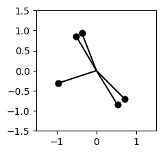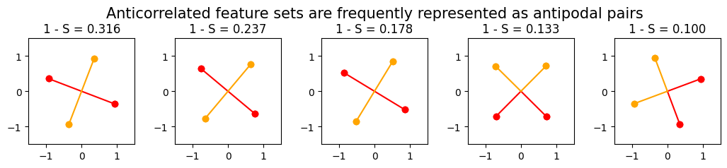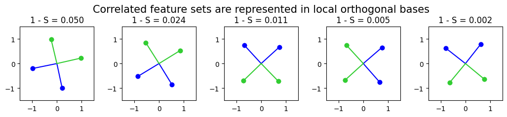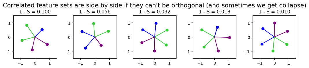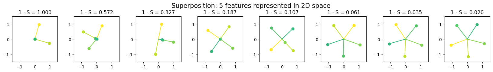 1️⃣ TMS: Superposition in a Nonprivileged Basis Learning Objectives Understand the concept of superposition, and how it helps models represent a larger set of features Understand the difference between superposition and polysemanticity Learn how sparsity contributes to superposition Understand the idea of the feature importance curve Learn how feature correlation changes the nature and degree of superposition Toy Model setup In this section, we'll be examining & running experiments on the toy model studied in Anthropic's paper. You can follow along with the paper from the Demonstrating Superposition section onwards; it will approximately follow the order of the sections in this notebook. This paper presented a very rudimentary model for bottleneck superposition - when you try and represent more than $n$ features in a vector space of dimension $n$. The model is as follows: We take a 5-dimensional input $x$ We map it down into 2D space We map it back up into 5D space (using the transpose of the first matrix) We add a bias and ReLU $$ \begin{aligned} h &= W x \\ x' &= \operatorname{ReLU}(W^T h + b) \end{aligned} $$ What's the motivation for this setup? The input $x$ represents our five features (they're uniformly sampled between 0 and 1). Each feature can have importance and sparsity. Recall our earlier definitions: Importance = how useful is this feature for achieving lower loss? Sparsity = how frequently is it in the input data? This is realised in our toy model as follows: Importance = the coefficient on the weighted mean squared error between the input and output, which we use for training the model In other words, our loss function is $L = \sum_x \sum_i I_i (x_i - x_i^\prime)^2$, where $I_i$ is the importance of feature $i$. Sparsity = the probability of the corresponding element in $x$ being zero In other words, this affects the way our training data is generated (see the method generate_batch in the Module class below) We often refer to feature probability (1 minus sparsity) rather than sparsity The justification for using $W^T W$ is as follows: we can think of $W$ (which is a matrix of shape (2, 5)) as a grid of "overlap values" between the features and bottleneck dimensions. The values of the 5x5 matrix $W^T W$ are the dot products between the 2D representations of each pair of features. To make this intuition clearer, imagine each of the columns of $W$ were unit vectors, then $W^T W$ would be a matrix of cosine similarities between the features (with diagonal elements equal to 1, because the similarity of a feature with itself is 1). To see this for yourself: t.manual_seed(2) W = t.randn(2, 5) W_normed = W / W.norm(dim=0, keepdim=True) imshow( W_normed.T @ W_normed, title="Cosine similarities of each pair of 2D feature embeddings", width=600, ) To put it another way - if the columns of $W$ were orthogonal, then $W^T W$ would be the identity. This can't actually be the case because $W$ is a 2x5 matrix, but its columns can be "nearly orthgonal" in the sense of having pairwise cosine similarities close to 0. Question - can you prove that W.T @ W can't be the identity when W has more columns than rows (or alternatively, when the hidden dimension is strictly smaller than the input dimension)? Proof #1: the rank of a matrix product $AB$ is upper-bounded by the maximum of the two factors $A$ and $B$. In the case of $W^T W$, both matrices have rank at most 2, so the product has rank at most 2. Proof #2: for any vector $x$, $W^T W x = W^T (Wx)$ is in the span of the columns of $W^T$, which is vector space with rank 2. Another nice thing about using two bottleneck dimensions is that we get to visualise our output! We've got a few helper functions for this purpose. utils.plot_features_in_2d( W_normed.unsqueeze(0), # shape [instances=1 d_hidden=2 features=5] ) Compare this plot to the `imshow` plot above, and make sure you understand what's going on here (and how the two plots relate to each other). A lot of the subsequent exercises run with this idea of a geometric interpretation of the model's features and bottleneck dimensions. Help - I'm confused about how these plots work. As mentioned, you can view $W$ as being a set of five 2D vectors, one for each of our five features. The heatmap shows us the cosine similarities between each pair of these vectors, and the second plot shows us these five vectors in 2D space. In the example above, we can see two pairs of vectors (the 1st & 2nd, and the 0th & 4th) have very high cosine similarity. This is reflected in the 2D plot, where these features are very close to each other (the 0th feature is the darkest color, the 4th feature is the lightest). ### Defining our model Below is some code for your model (with most methods not filled out yet). It should be familiar to you if you've already built simple neural networks earlier in this course. Some notes on the initialization method, which is filled out for you: #### Weights & instances The `Config` class has an `n_inst` class. This is so we can optimize multiple models at once in a single training loop (this'll be useful later on). You should treat this as basically like a batch dimension for your weights: each of your weights/biases will actually be `n_inst` separate weights/biases stacked along the zeroth dimension, and each of these will be trained independently, on different data, in parallel (using the same optimizer). We initialize weights `W` and `b_final`, which correspond to $W$ and $b$ in the Anthropic paper. #### Sparsity & Importance The `feature_probability` argument tells us the probability that any given feature will be active. We have the relation `feature_probability = 1 - sparsity`. We'll often be dealing with very small feature probabilities $p = 1 - S \approx 0$, i.e. sparsities close to 1. The feature probability is used to generate our training data; the importance is used in our loss function (see later for both of these). The default is `feature_probability = 0.01`, i.e. ea