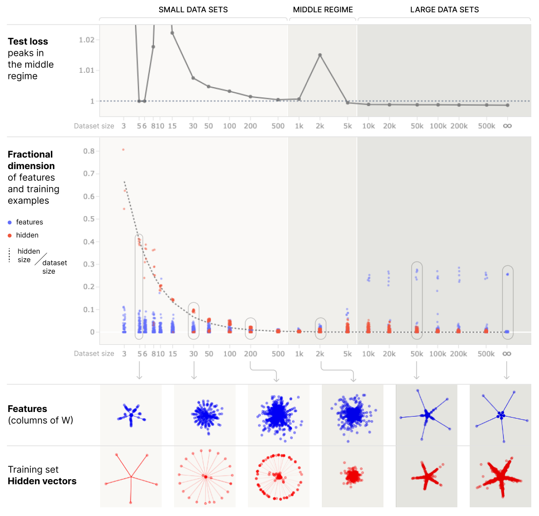 - Later, the model learns a generalizing solution where features are learned and represented in superposition. This generalizes, so we get low training loss and low test loss.