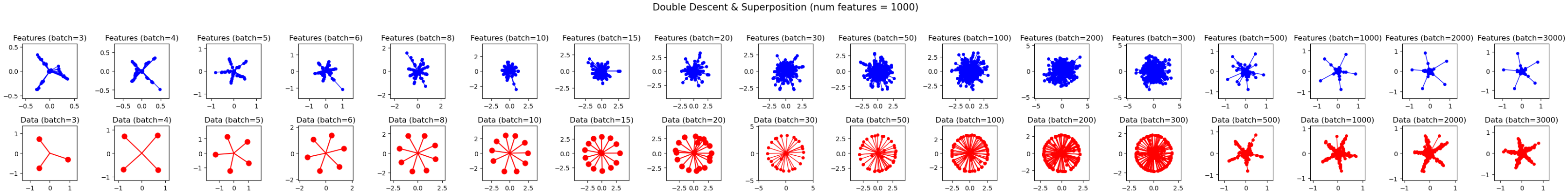 We'll study this theory in the context of a toy model. Specifically, we'll use the toy model that we worked with in the first section of this paper, but we'll train it in a very particular way: by generating a random batch of data, and then using that same batch for the entire training process. We'll see what happens when the batch sizes change, but the number of features change. According to our theory, the model should represent datapoints in superposition when the batch size is smaller than the number of features, and it should represent features in superposition when the batch size is larger than the number of features.