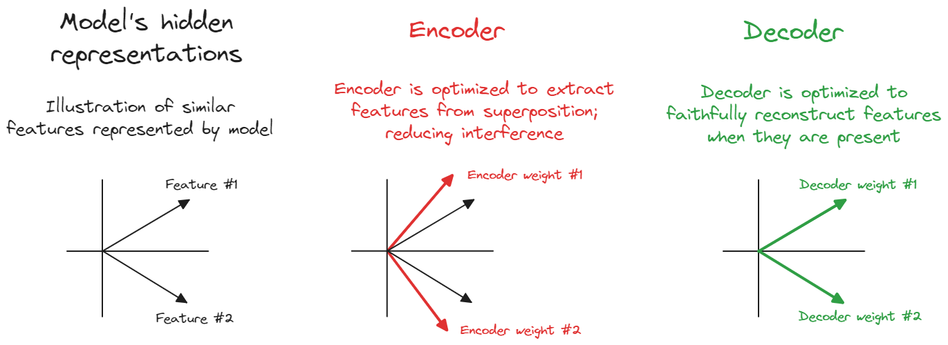 It's important not to get confused between the autoencoder and model's notation. Remember - the model takes in features $x$, maps them to lower-dimensional vectors $h$, and then reconstructs them as $x'$. The autoencoder takes in these hidden states $h$, maps them to a higher-dimensional but sparse vector $z$, and then reconstructs them as $h'$. Our hope is that the elements of $z$ correspond to the features of $x$.