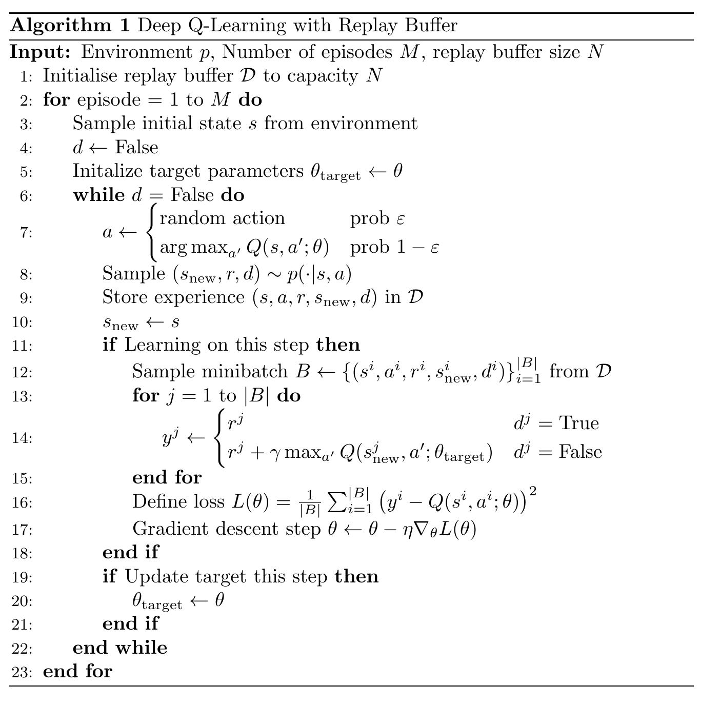 In RL, the distribution of experiences $e_t = (s_t, a_t, r_{t+1}, s_{t+1})$ to train from depend on the policy $\pi$ followed, which depends on the current state of the Q-value network, so DQN is always chasing a moving target. This is why the training loss curve isn't going to have a nice steady decrease like in supervised learning. We will extend experiences to $e_t = (s_t, a_t, r_{t+1}, s_{t+1}, d_{t+1})$. Here, $d_{t+1}$ is a boolean indicating that $s_{t+1}$ is a terminal observation, and that no further interaction happened beyond $s_{t+1}$ in the episode from which it was generated.