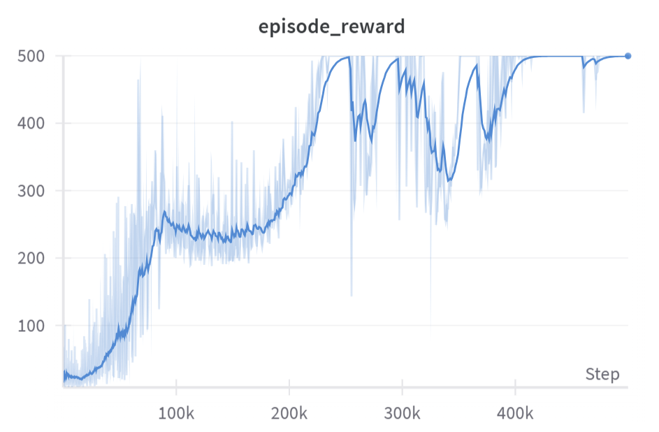 Note - you might see performance frequently drop off after it's achieved the maximum for a while, before eventually recovering again and repeating the cycle. Here's an example CartPole run using the solution code: