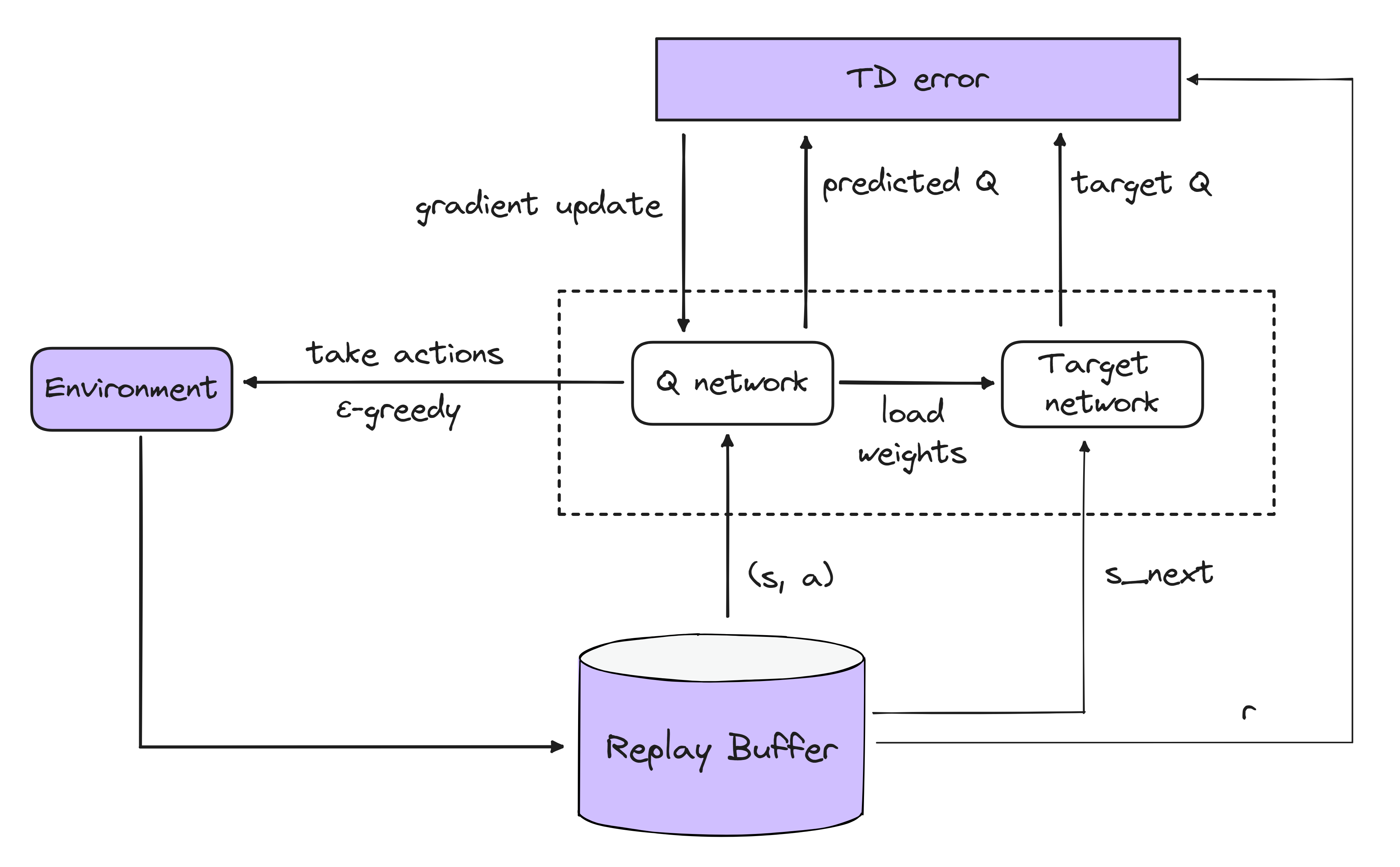 - To increase stability, we also have a target network we use for the "next step" part of the TD error. This is a lagged copy of the Q-network (i.e. we update our Q-network via gradient descent, and then every so often we copy the Q-network weights over to our target network).