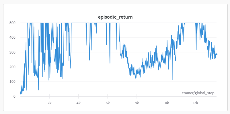 Yesterday during DQN, we covered catastrophic forgetting - this is the phenomena whereby the replay memory mostly contains successful experiences, and the model forgets how to adapt or recover from bad states. In fact, you might find it even more severe here than for DQN, because PPO is an on-policy method (we generate a new batch of experiences for each learning phase) unlike DQN. Here's an example reward trajectory from a PPO run on CartPole, using the solution code: