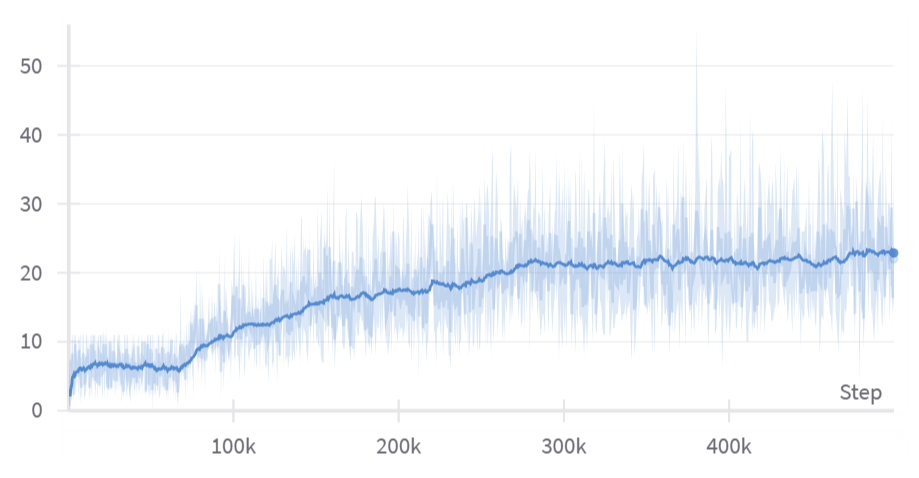 Note that this will probably take a lot longer to train than your previous experiments, because the architecture is much larger, and finding an initial strategy is much harder than it was for CartPole. Don't worry if it starts off with pretty bad performance (on my machine the code above takes about 40 minutes to run, and I only start seeing any improvement after about the 5-10 minute mark, or approx 70k total agent steps). You can always experiment with different methods to try and boost performance early on, like an entroy bonus which is initially larger then decays (analogous to our epsilon scheduling in DQN, which would reduce the probability of exploration over time).