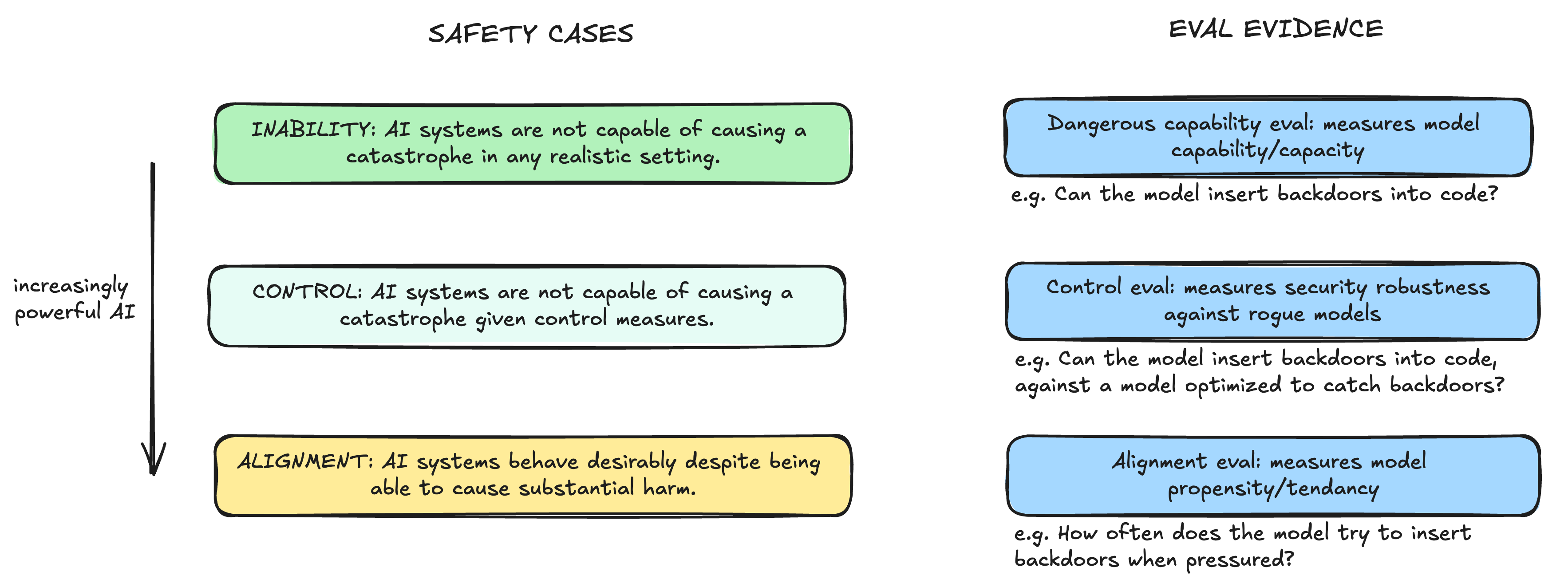 A useful framing is that evals aim to generate evidence for making "safety cases" — a structured argument for why AI systems are unlikely to cause a catastrophe. A helpful high-level question to ask when designing an evaluation is "how does this evidence increase (or decrease) AI developers' confidence in the model's safety?" Different evaluations support different types of safety cases: for instance, dangerous capability evals might support a stronger safety argument of "the model is unable to cause harm", as compared to alignment evals, which might support a weaker argument of "the model does not tend to cause harm". However, the former may have less longevity than the latter, as we expect AI systems to have these dangerous capabilities as they become more advanced. More concretely, for any safety case, we want to use evaluations to: